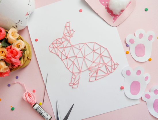 Nos últimos meses, estou gostando bastante de decoração/desenhos com formas geométricas e então, entre uns cliques e outros pelo Pinterest e Google, achei uma imagem de um coelho geométrico lindo demais! No começo, pensei em só fazer uma ilustração mesmo, mas como estou testando novas técnicas para ilustração e artesanato, resolvi pegar uma linha para bordado e fazer todo o processo com ela mesmo, bordando o papel e olha, o resultado ficou mais bonito de que eu esperava e eu fiquei completamente apaixonada! Gostei mais ainda, pois não é preciso ter habilidade nenhuma pra fazê-lo e qualquer pessoa tem os materiais em casa, ó: